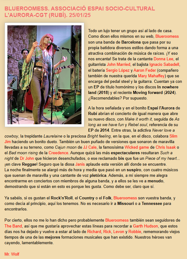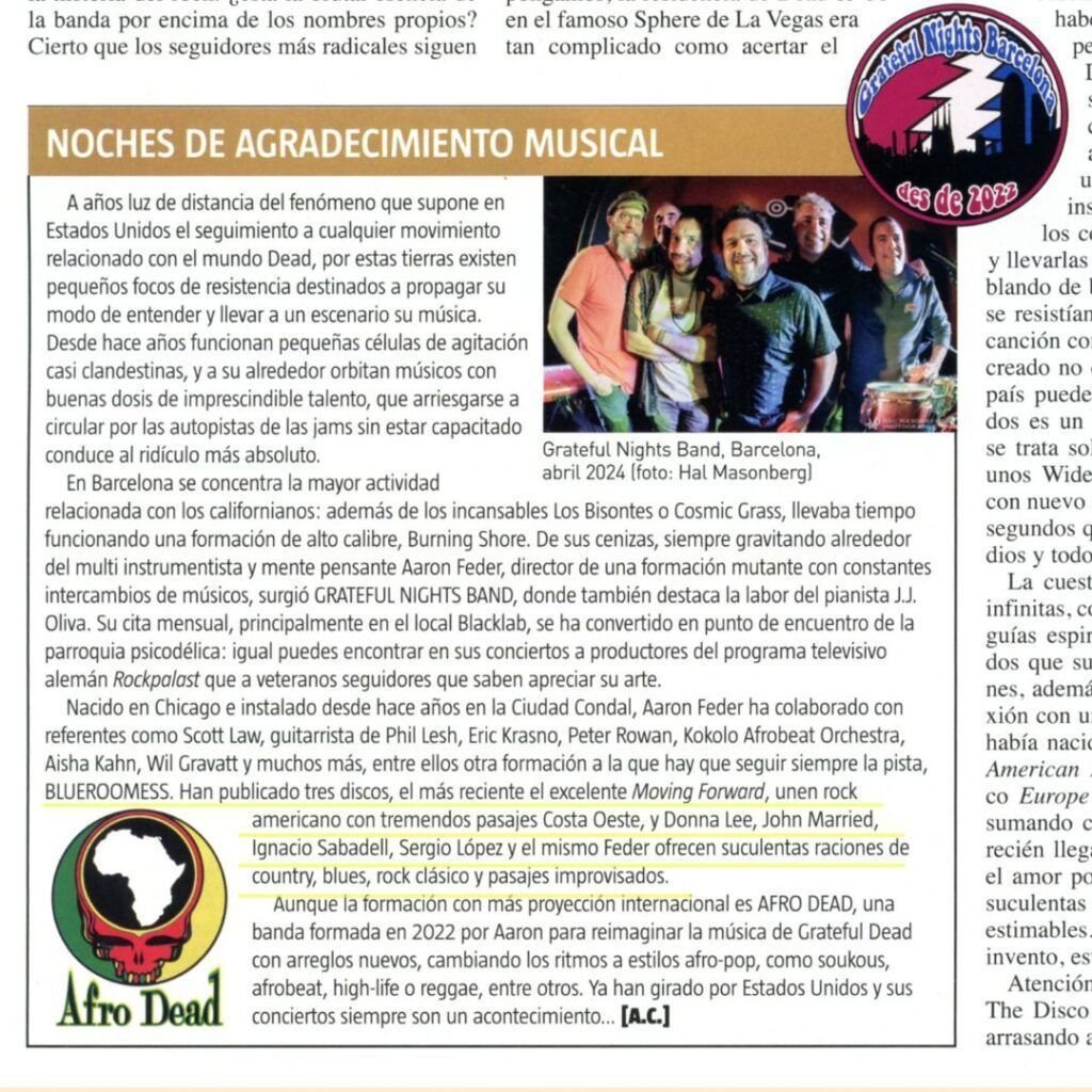Destacando la labor de Aaron Feder en la divulgación y celebración de la música de Grateful Dead en la Ciudad condal, se menciona también nuestro último trabajo con Blueroomess «Moving Forward» (Revista Ruta 66, Enero 2025)